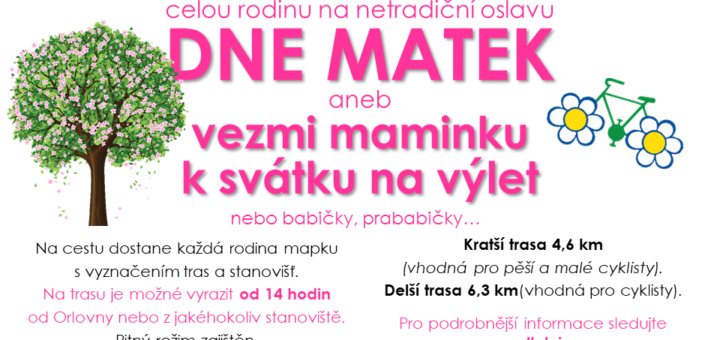 Ve spolupráci se Spolkem pro postavení a udržování Orlovny v Telnici vás zveme na netradiční oslavu Dne matek, který letos připadá na neděli 9. května. Vezměte svoji maminku (nebo babičku, prababičku) na rodinný výlet a vydejte se na kole či pěšky na trasu Telnicí a okolím s tématickými soutěžemi. :) Akce se koná v rámci Jihomoravského bicyklení.