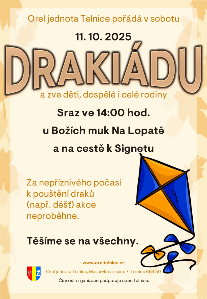 Zveme všechny děti i dospělé ke společnému strávení času typickou podzimní aktivitou – pouštěním draků. Sejděme se v sobotu 11. října v 14:00 u Boží muky Na Lopatě a užijme si společné odpoledne venku na polích. :)