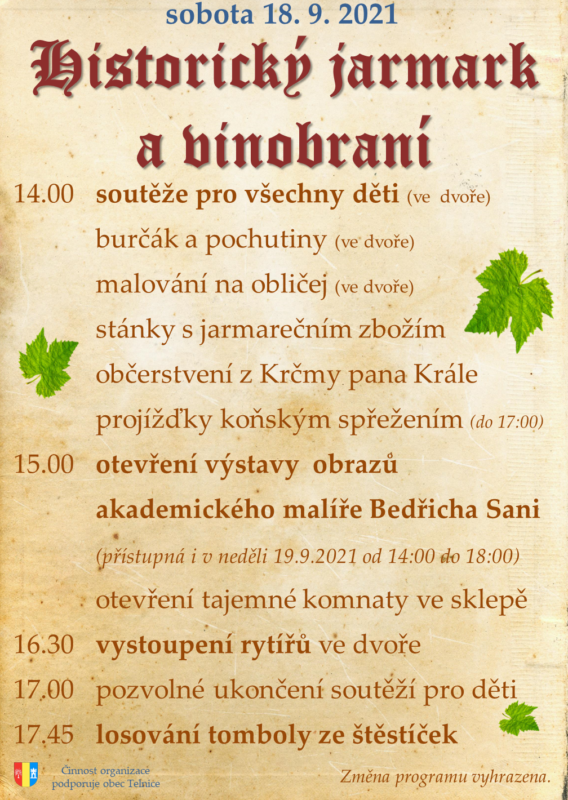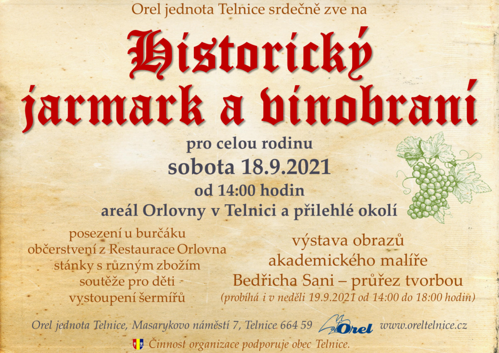 Historický jarmark a vinobraní 18.9.2021 by Anna Životská · 31. 8. 2021 Akce pro celou rodinu – zveme Vás na Orlovnu a do jejího okolí na jarmark s nejrůznějším zbožím, na výtečný burčák z Nesvačilky, na vystoupení šermířů i soutěže pro děti či na výstavu obrazů a další. Těšíme se na setkání s Vámi.