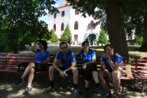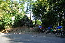 V neděli jsme ráno vyrazili nejdříve do Podhradí na Dyji, nad kterým se tyčí zřícenina hradu. Ale protože počasí dnes bylo na cyklistiku příznivé, tzn. sluníčko bylo schované, raději jsme nejprve vyrazili do Uherčic na zámek. Cesta nejprve vedla údolím kolem Dyje, ale jakmile jsme přejeli most přes řeku, opět na nás čekal výšlap do kopce. Příjemné bylo, že Uherčice byly jen kilometr za vrcholem. Poněkud méně příjemné bylo zjištění, že zámek je z důvodu natáčení pohádky Věneček, uzavřený. Zklamání ale hned bylo zažehnáno velice příjemnou restaurací v penzionu Na kolářce, hned vedle zámku. Posilněni výborným obědem jsme se vydali zpátky na zříceninu hradu Frejštejn nad vesničkou Podhradí na Dyji. Prozkoumali jsme ji a obdivovali tehdejší stavitele takovýchto staveb, jak uměli vystavět z různorodých kamenů rovné zdivo.