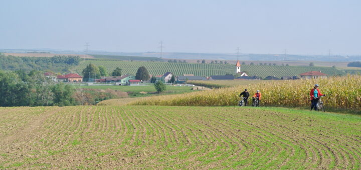 Ráno po snídani jsme se srotili na parkovišti před hotelem i s dalšími, kteří přijeli pouze na sobotu, připravili si svoje bicykly, vyfotili se a vyrazili na první kilometry po vinařských stezkách severní části znojemské oblasti. Hned na začátek jsme si vyšlápli kopec k hájence nad Moravským Krumlovem a pak jsme ho vzápětí sjeli do Jezeřan-Maršovic, kde na nás čekal ve vinařství Vinné sklepy Maršovice mladý muž, který nám nalil červeného burčáku (ještě to byla sladká šťáva) a popovídal nám o místním vinařství. Sice nám moc nedoporučoval cestu po polní cestě, ale nakonec to byl příjemný úsek mezi kukuřicí a podél remízku s velkými plody ořešáku černého (vygoogleno). Pak jsme se napojili na vedlejší silnici a po ní se dostali až do Bohutic.
