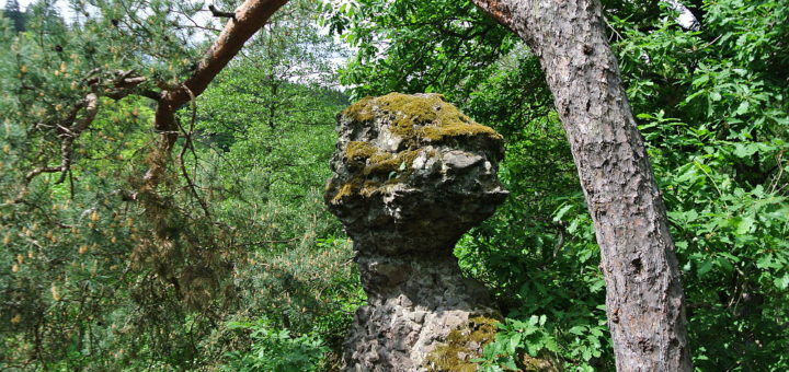Pak jsme se vydali dále a kousek za Drásovem jsme ze silnice sjeli na polní cestu a pak na naučnou stezku včelařskou – cestu medu. Ta vedla už kolem potoka Lubě, až do Skaličky. Tou jsme projeli a znovu jsme se připojili k potoku Lubě. Na začátku cesty za Skaličkou bylo upozornění, že cesta je vhodná pro MTB (horská kola), což nás trochu vyděsilo, ale za chvíli jsme zjistili, proč toto upozornění. Cesta totiž potok několikrát křižovala a museli jsme tím pádem projíždět několika brody. Všechny jsme bez potíží zvládli a přiblížili se ke křižovatce ke Krkaté bábě a Jižnímu portálu, což je občerstvovací stanice, kde jsme se chtěli naobědvat. Nakonec nás přehlasovala mladší část osazenstva a nejprve jsme se vydali posilnit. Po obědě a odpočinku jsme se tedy vydali zpět k potoku Lubě a ke zmiňovanému skalnímu útvaru Krkatá bába. Ten jsme si prohlédli zespodu z cesty a většina i z přilehlých okolních skal.