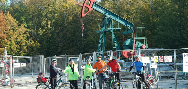 Tady byl k prohlídce pouze altánek, pomník padlého partyzána a informační tabule, kde jsme se mohli dočíst, že tu stávala hájenka. Dál nás zvlněná cesta vedla dále krásnou podzimní přírodou a podél cesty se na nás smály krásné bedly. Napojili jsme se na turistickou cyrilometodějskou stezku, která kříží další silnici z Bučovic do Ždánic. Pořád ještě po cyklostezce č. 473 jsme se dostali k velkému ropnému vrtu nad Ždánicemi, kde jsme se prostřednictvím informační cedule seznámili, kde se tu ropa vzala a jak se těží. U toho Jirka vyměnil píchlou duši a pokračovali jsme dál kolem dalších menších vrtů na rozcestí U slepice. Tady končila naše cesta po hřebenu Ždánického lesa a užili jsme si asi 5 km sjezd do Lovčic po cyklostezce č. 412 a 5095. Odtud jsme pokračovali do Ždánic. A protože byl čas oběda, zajeli jsme do restaurace Radlovec vedle zámku. Po chvíli se do restaurace dostavili členové kapely Dambořanka, kteří doprovázeli místní stárky, kteří obcházeli dědinu a zvali všechny na hody. Po výborném obědě jsme opět nasedli na naše oře a pokračovali do Archlebova. I když jsme už jeli po silnici, tak terén byl ještě vlnitější, než na hřebenu lesa. Z Archlebova cesta vede do Žarošic. Hned na kraji vesnice nás místní Vinařství Žarošice zvalo na burčák, tak jsme neodolali a ochutnali z místní letošní úrody. Robert se Zdeňkem ale byli moc rychlí a tuto nabídku minuli. Většina z nás si ale všimla a zastavili jsme na malou přestávku, abychom nejenom ochutnali burčák, ale zároveň se napili na zdraví vnoučka Jirky a Marušky, kteří nás na skleničku pozvali. To už bylo před námi posledních 5 km do cíle dnešní trasy (cyklo č. 5095). Vyšlápli jsme kopeček nad Žarošice, pak ještě poslední kopec nad Dambořicemi a vjeli jsme do Dambořic. U doprovodného vozidla už čekal Zdeněk, Robert se vydal na svém lehokole už domů. Naložili jsme své unavené oře a sebe a jeli do Újezda ke Spáčilům, kam jsme dostali během našeho cyklovýletu pozvánku na štrůdl a kávu.