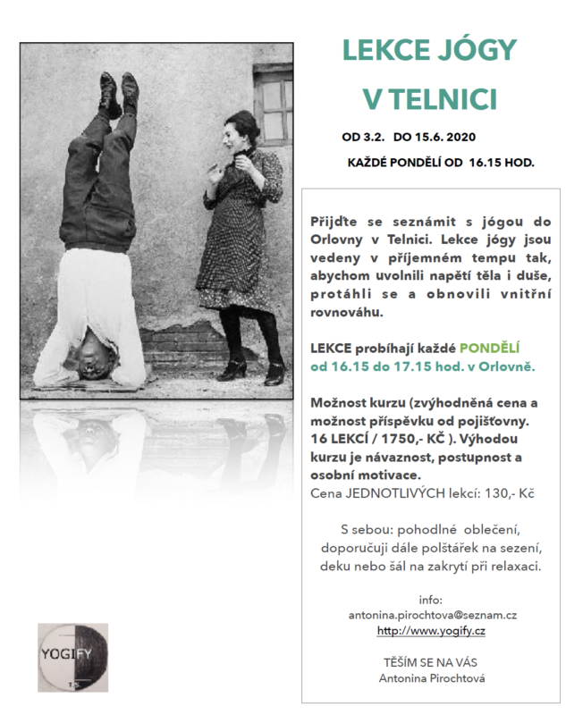 Lekce jógy od února do června by Anna Životská · 20. 1. 2020 Antonina Pirochtová a OJT zvou na lekce jógy i v roce 2020 – otevírá se kurz o 16 lekcích, přijít ale můžete i bez přihlášení do kurzu. Tak připravit cvičební podložky a potkáme se na Orlovně.