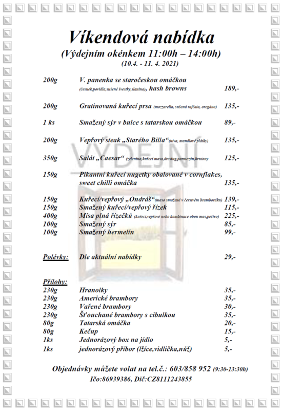 Restaurace Orlovna oznamuje, že výdejní okénko bude nově otevřeno i o víkendu vždy v čase od 11:00 do 14:00 hodin. O víkendech můžete vybírat z tého nabídky: