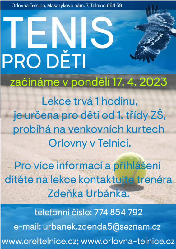 Hodinová lekce tenisu pro děti probíhá na tenisových kurtech se zkušeným trenérem Zdeňkem ve skupinkách podle věku a úrovně dovedností. Děti se učí techniku, zvyšují svoji kondici i koordinaci v prostoru. Lekce probíhají v době venkovní sezóny (březen-říjen), podle zájmu i v průběhu letních prázdnin. Pro účast na lekcích je třeba vyplnit přihlášku, na lekci je možné se přijít podívat. V případě zájmu kontaktujte trenéra.