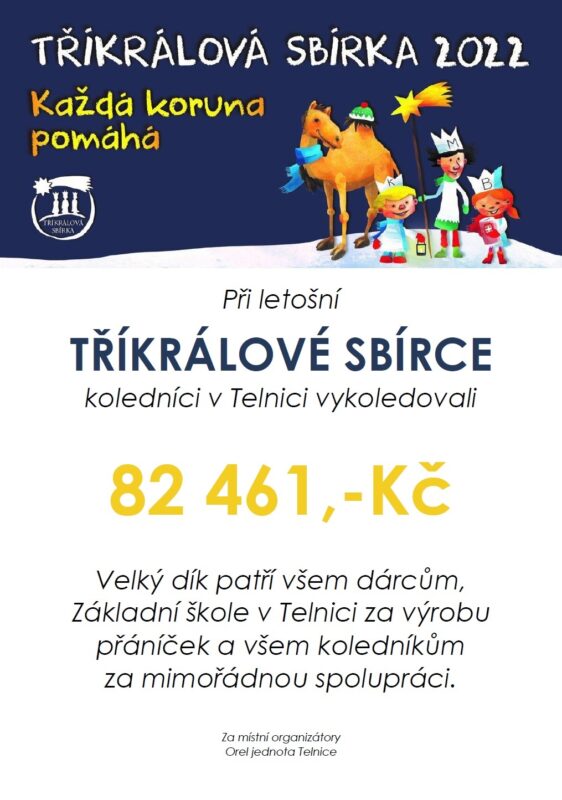Při letošní Tříkrálové sbírce bylo vykoledováno do kasiček celkem 82.461,- Kč. Děkujeme dárcům, koledníkům, dětem ze školy za přáníčka a každému, kdo jakkoli přispěl k vydařené sbírce. :)
