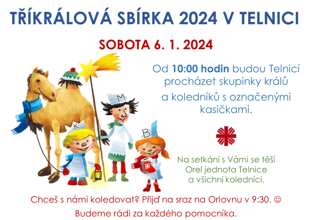 My tři králové jdeme k Vám – k Vám v Telnici v sobotu 6. 1. 2024, vyrážíme v 10:00 od Orlovny jako skupinky králů, abychom obešli celou obec a vybírali do Charitních kasiček pro Tříkrálovou sbírku. Každá koruna pomáhá.