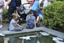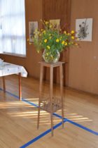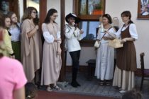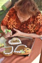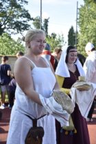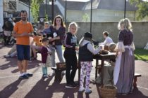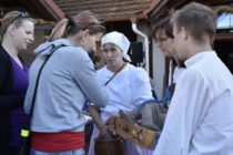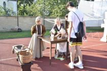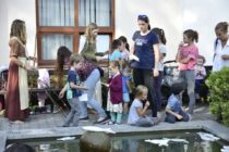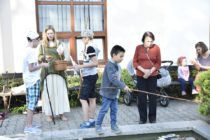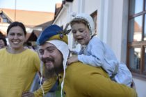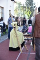 Snad bychom měli prohlídku zrychlit, proběhneme tedy s dětmi orlovnou na hřiště, nacházíme se najednou na dvoře Rudolfa II, vypustíme je na stanoviště roztroušená všude kolem, aby si mohly pohrát a zasoutěžit, a dáváme se prudce doprava rovnou do koutku s burčákem od Husáků. Po načerpání této zdravé tekutiny se můžeme posadit a konečně se v klidu porozhlédnout. Přes děvčata, kreslící na obličeje, vidíme, že v levém rohu směrem k faře mají své stanoviště rytíři se svými ženami, ti se k nám dostali až z doby Karla IV., a jak se zdá, rudolfovský dvůr jim nevadí. Ženy dávají kolemjdoucím ochutnávat svoje středověká jídla, muži zase něco ze svého válečného umění. Vpravo od rytířů již probíhá soupeření dětí na stanovištích. Je potřeba semlít mouku, postavit zeď, napéct pletýnky, s kejklíři se projít na chůdách, uplácat z hlíny Golema, utkat s tkalci kus rohože, pomoct zlatníkům přebrat drahokamy, s lovci ulovit něco k snědku. Vzápětí procházíme kolem hradu, kde probíhá boj o princeznu a odtud už se dostáváme k písařům, kde je třeba napsat a zapečetit zprávu. A hned za písaři, v zavřené komnatě, probíhá škola houslí Martina Husáka. Sem smí vstoupit jen děti a my s rodiči trpělivě čekáme a nakukujeme oknem. Potom děti zjistí, že je čeká ještě výlov ryb, zanechávají své rodiče opět u burčáku a běží k rybníčku před Orlovnou splnit poslední úkol. Tak se cesty dětí a dospělých na chvíli rozdělují. Děti s kapsami plnými tolárků čeká uvnitř tajemná komnata, ve které alchymisté zřídili svoji dílnu a provádějí své pokusy. Nechme je tedy chvíli samotné. My dospělí obracíme od burčáku svoji prohlídku také dovnitř budovy a kromě těch, kterým zrychlil burčák krok natolik, že se musí ubírat v budově prudce doleva, ostatní vycházkovým krokem pokračují doprava do sálu, kde se mohou zdržet, jak dlouho chtějí, a užít si výstavu „Kouzla z nití“. Mezi výšivkami, které vesměs shromáždila naše paní perníkářka Lenka Umlášková ze své rodiny a mezi květinovými aranžmá RNDr. Jany Saňové se zastavil čas a můžeme se zastavit i my. Zde také končí naše virtuální prohlídka.